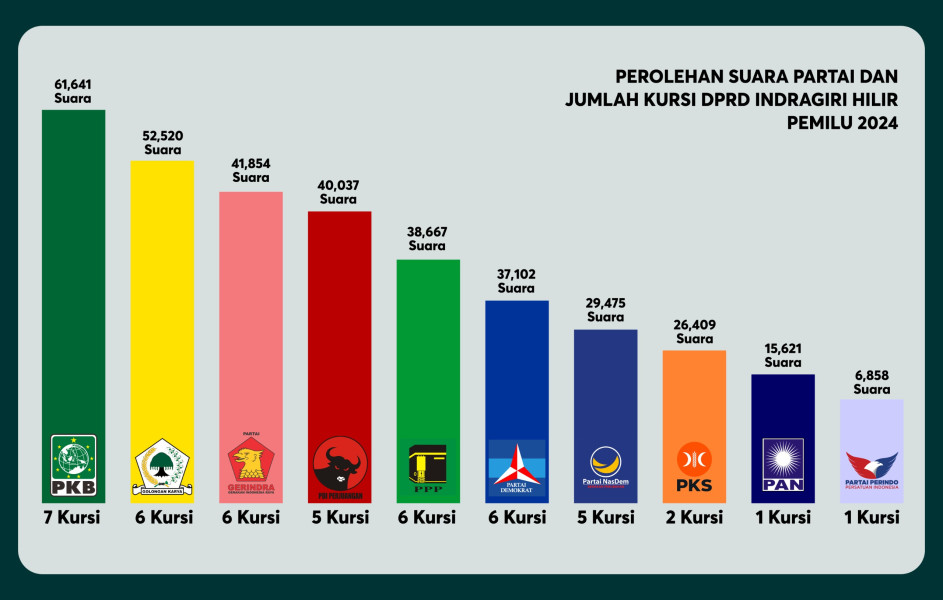 Inhil,- Berdasarkan hasil penghitungan suara melalui pleno di tingkat PPK, Partai Kebangkitan Bangsa (PKB) berhasil menjadi pemenang Pemilihan Legislatif (Pileg) tahun 2024 di Kabupaten Indragiri Hilir (Inhil) dengan meraih 7 kursi.