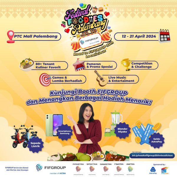 Untuk itulah maka FIFGROUP hadir sebagai sponsor utama di Festival Foodies Palembang bersama FIFGROUP - Road to FIFGROUP 35th Localicious yang berlangsung pada 12-21 April 2024. FIFGROUP ingin ikut mendukung pertumbuhan perekonomian di Sumatera Selatan khususnya Kota Palembang, melalui pengembangan bisnis para pelaku Usaha Mikro, Kecil, dan Menengah (UMKM), dengan menghadirkan lebih dari 80 tenant kuliner serta berbagai acara menarik lainnya.