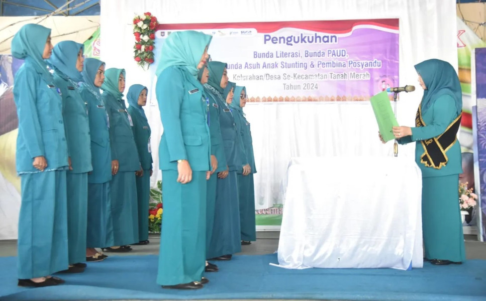 INDRAGIRIONE.COM,INHIL - Pj Ketua TP PKK Inhil Hj. Katerina Susanti Herman Mengukuhkan Bunda Literasi, Bunda PAUD dan Bunda Asuh Anak Stunting Serta Pembina Posyandu Kelurahan/Desa Se Kecamatan Tanah Merah, Minggu (31/03/2024).