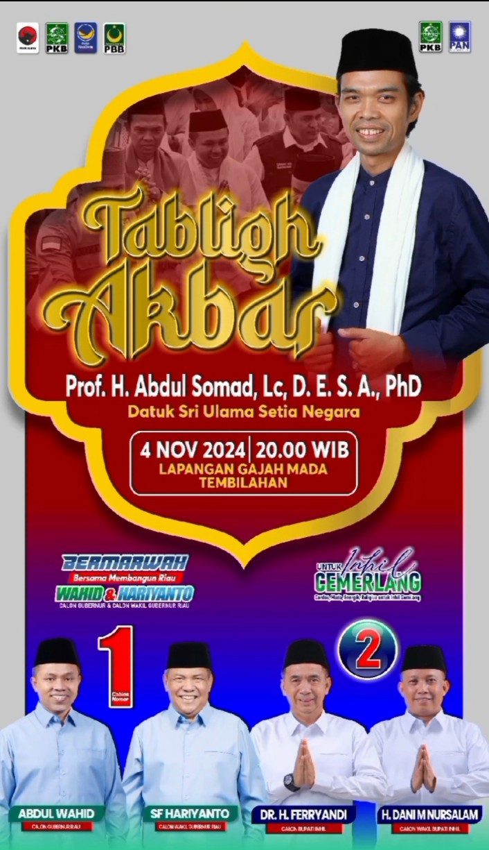 Muammar AR, Ketua Tim Koalisi Bermarwah Kabupaten Inhil, mengatakan bahwa permintaan sebagian besar masyarakat Tembilahan menghadirkan UAS dapat dikabulkan oleh Calon Gubernur Riau Nomor Urut 1 (H Abdul Wahud - SF Hariyanto).