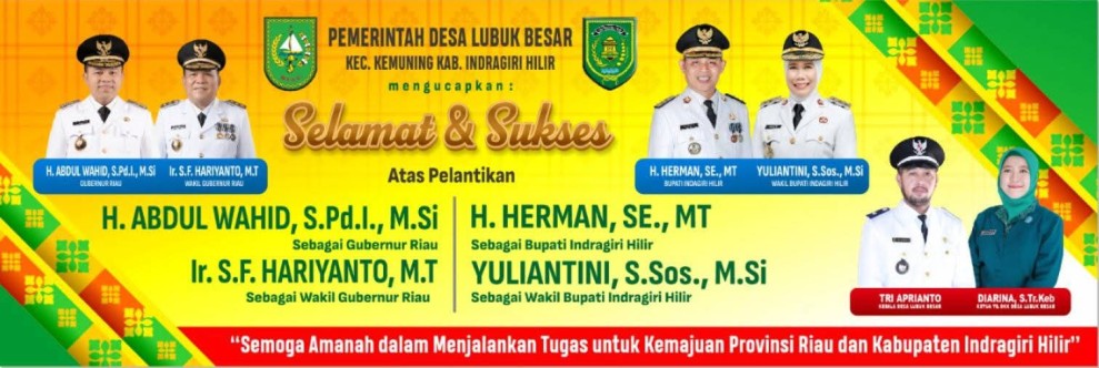 Inhil,- Seluruh jajaran Pemerintah Desa Lubuk Besar mengucapkan Selamat dan Sukses atas dilantiknya Gubernur Riau (H. ABDUL WAHID, S.Pd.I., M.Si) dan Wakil Gubernur Riau (Ir. S.F. HARIYANTO, M.T) beserta Bupati Indragiri Hilir (H. HERMAN, SE., MT) dan Wakil Bupati Indragiri Hilir (YULIANTINI, S.Sos., M.Si).