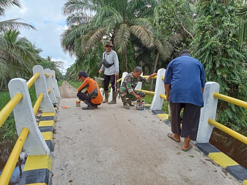 INDRAGIRIONE.COM,- INHIL - Personel Kodim 0314/Inhil yang tergabung dalam program TNI Manunggal Membangun Desa (TMMD) ke-123 melaksanakan pengecatan pada sasaran fisik rehabilitasi pembangunan jembatan di Desa Karya Tunas Jaya, Kecamatan Tempuling, Rabu (5/3/2025).